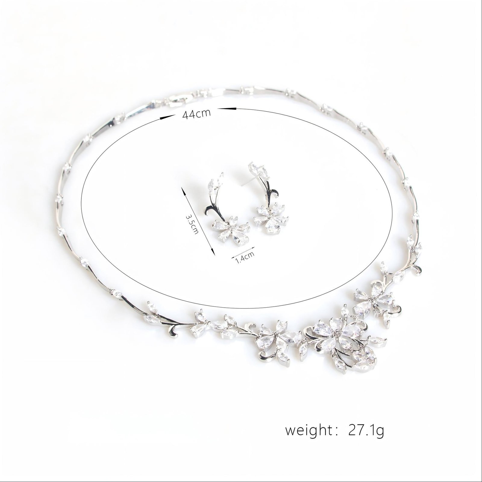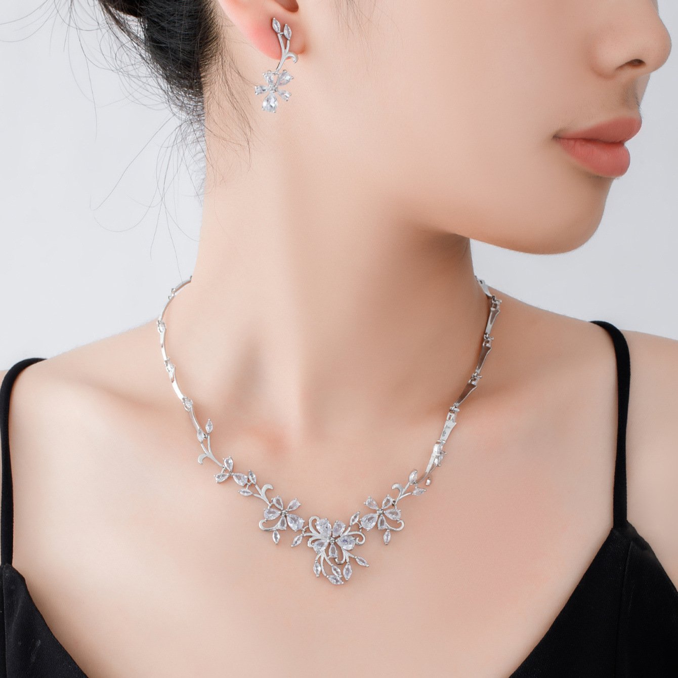 Brides can wear a zircon necklace set with a floral vine design and refreshing, simple petal accessories.
